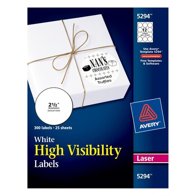 Avery High Visibility Laser Shipping Labels, 2.5"Dia., White, 300/Pack ... Avery High Visibility Laser Shipping Labels, 2.5"Dia., White, 300/Pack (5294)$12.29Pack See Details This item ships FREE * Qty Add to Cart Description Specifications Reviews Accessories Customer Also Viewed Avery TrueBlock Inkjet Shipping Labels, Sure Feed Technology, 3 1/3" x 4", White, 150 Labels Per Pac 4.7(785) $15.79Pack Avery High Visibility Laser Shipping Labels, 2" x 4", Neon Green, 1000 ... Avery High Visibility Laser Address Labels, 1" x 2-5/8", Neon Green, 750 Labels Per Pack (5971) $29.99 Box When you buy 5+ This item ships FREE * Qty Add to Cart 4.8 (367) Avery TrueBlock Laser Shipping Labels, Sure Feed Technology, 2" x 4", White, 1000 Labels Per Pack (5 $36.99 Box When you buy 20+ This item ships FREE * Qty Add to Cart 4.6 (18) Avery High-Visibility Permanent Laser ID Labels, 1 x 2 5/8, Neon Green ... Avery High-Visibility Permanent Laser ID Labels, 1 x 2 5/8, Neon Green, 750/Pack. 1" x 2 5/8" - 30 Labels/ Sheet - 750 Labels/ Pack - Neon Green - Use With Laser Printers. $18.71. Add a recurring subscription and save 5%! Learn more. Delivery ZIP Code: To estimate availability and delivery date, please enter your delivery ZIP Code.
