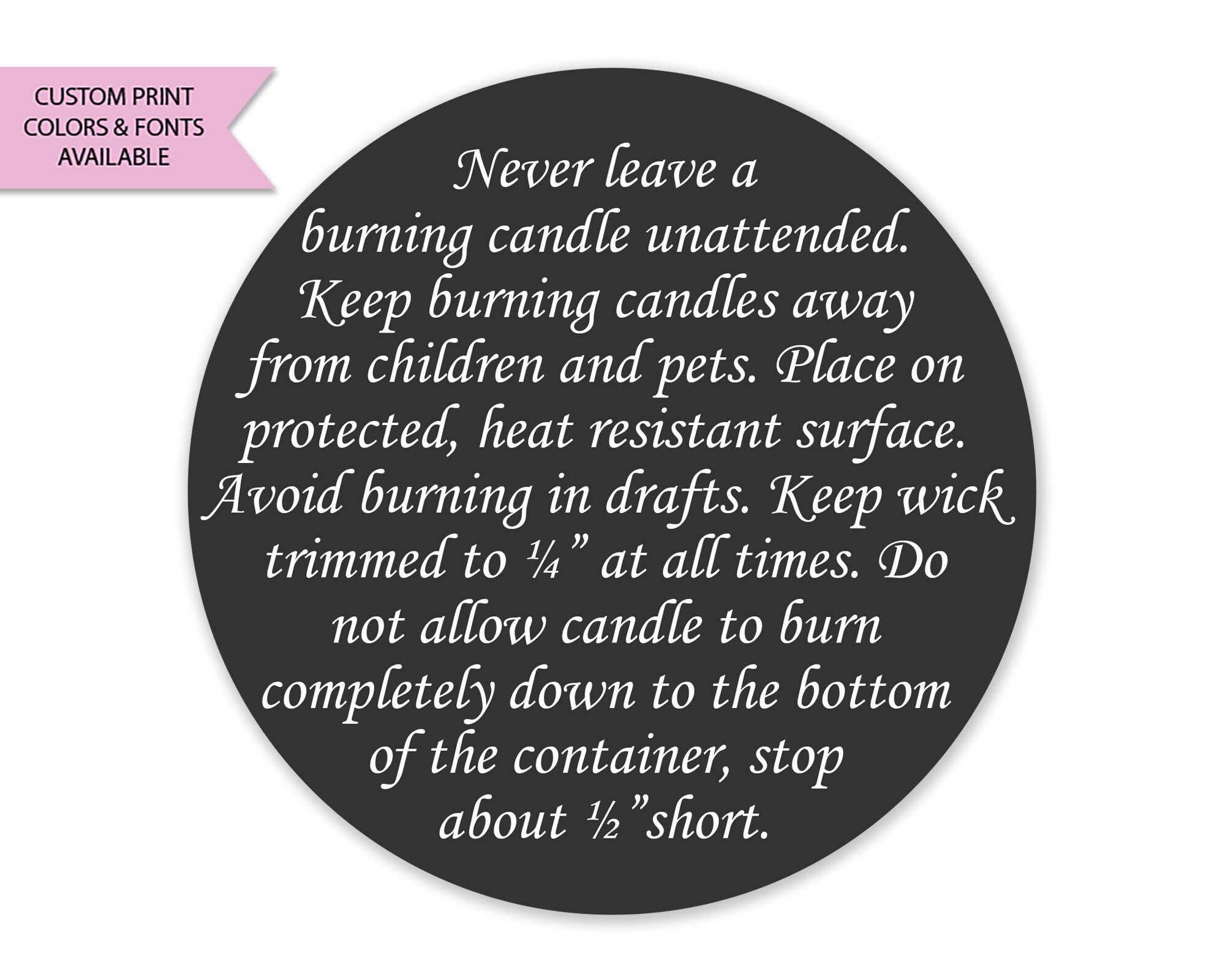 Candle-Safety-Labels | Candle Packaging The candle warning label is 50mm round and finished with a matt laminate. When you place your candle box order, please advise which label style A or B you prefer. Please provide your brand name and contact details you would like shown. eg. Brand name, your website address, postal address, contact number.
